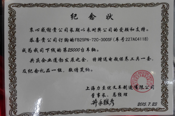 热烈祝贺上海力至优叉车制造有限公司第25000台叉车正式下线。