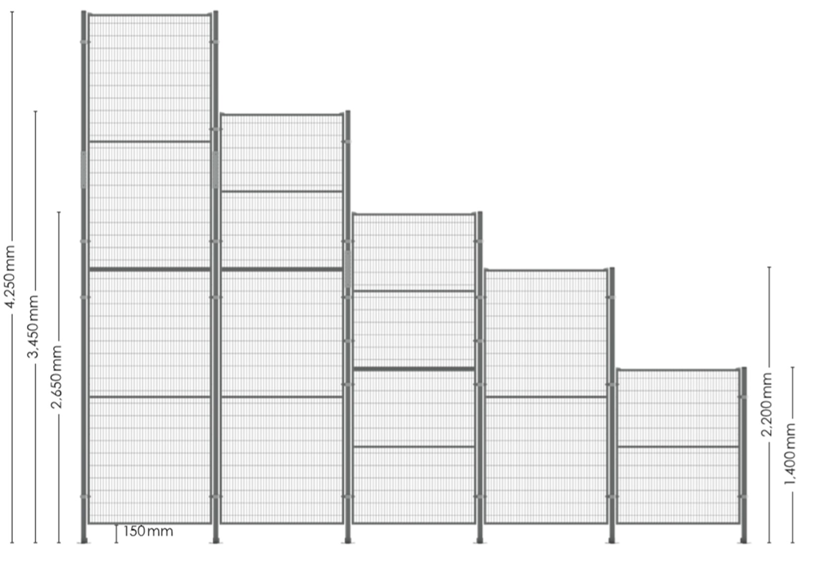 系统尺寸 这套围栏系统的标准高度为 1400 mm 到 4250 mm。护板 提供八种宽度,从 200 mm 到 1500 mm,离地间隙 150 mm, 便于清洁。护板和立柱均可自由 定制,以得到所需尺寸。所有系 统的固定件、防护面板和立柱均 常备库存,可以立即发货。