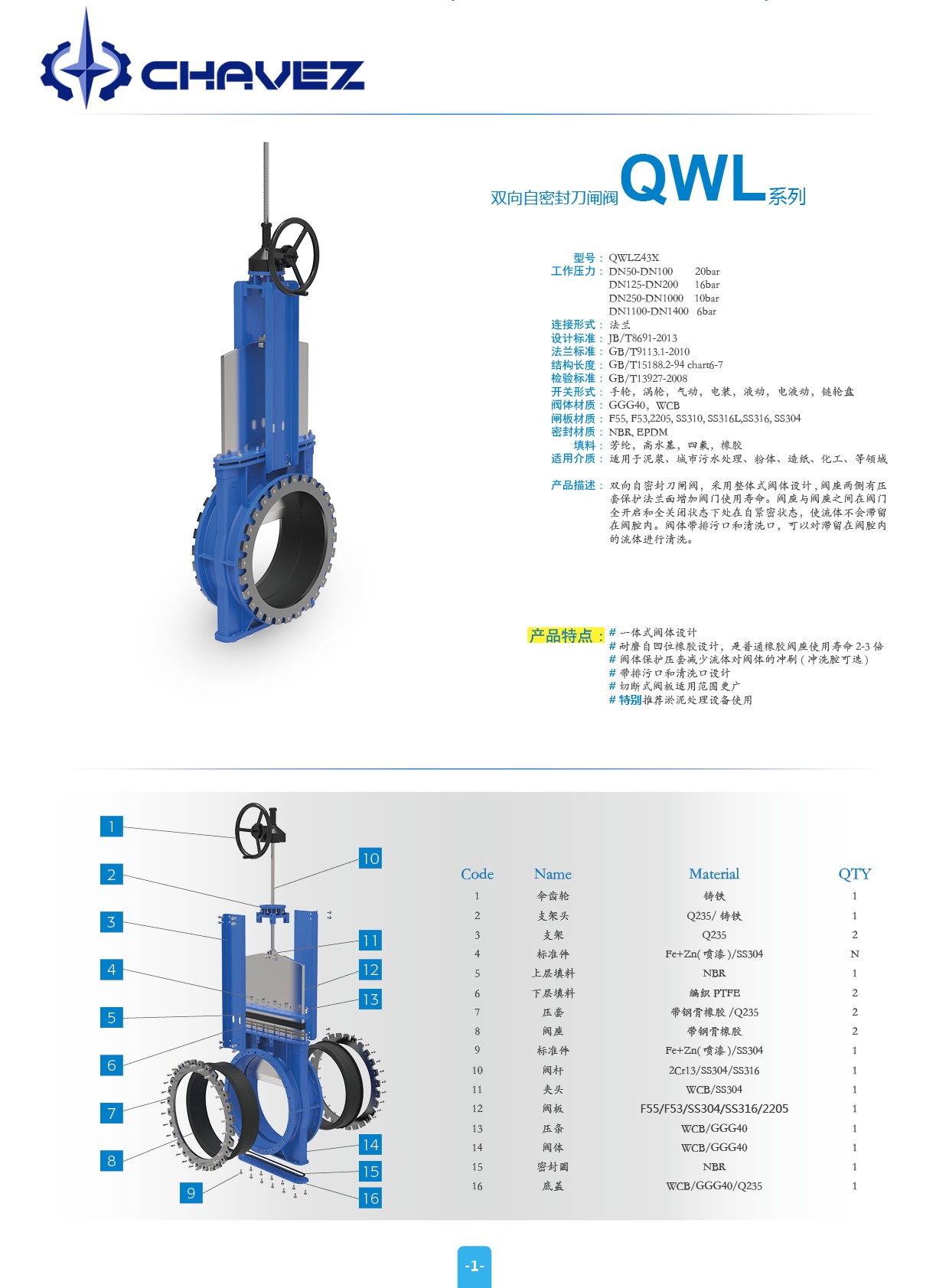 双向自密封刀闸阀,采用整体式阀体设计, 阀座两侧有压 套保护法兰面增加阀门使用寿命。阀座与阀座之间在阀门 全开启和全关闭状态下处在自紧密状态,使流体不会滞留 在阀腔内。阀体带排污口和清洗口,可以对滞留在阀腔内 的流体进行清洗。
