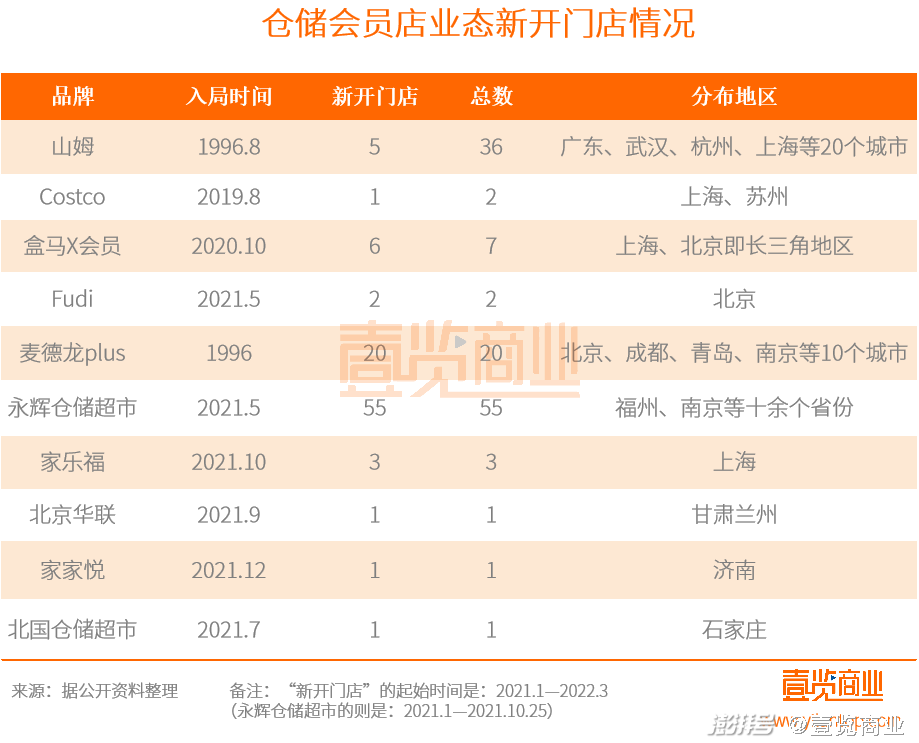 这一年,除山姆、Costco等外资企业依旧加速扩张外,包括永辉超市、Fudi、家家悦、人人乐等多家本土实体零售企业也纷纷入局。据壹览商业不完全统计,从2021年到2022年3月底,全国新开业仓储会员店(仓储店)超过100家。