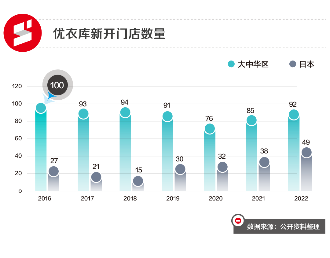 长江证券数据显示,2010年,进入中国市场八年的优衣库,在中国的门店数量仅为54家,平均每年开店不到7家。而2010年之后,优衣库大中华区每年的新开门店数量都达到了70家到100家。