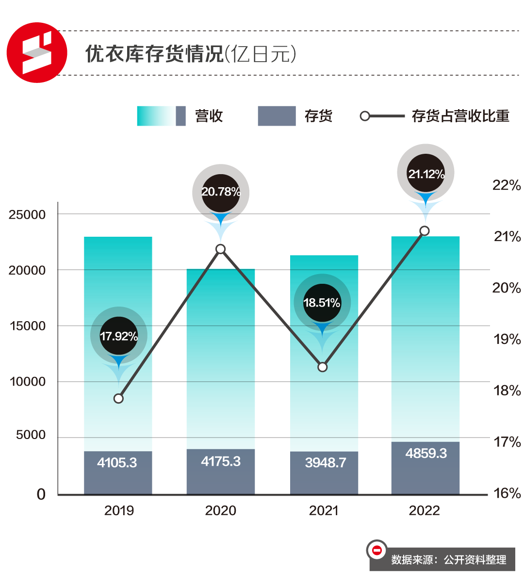 2022财年优衣库存货规模达到4859亿日元,占营收的比重也从2019财年的18%上升到21%左右。