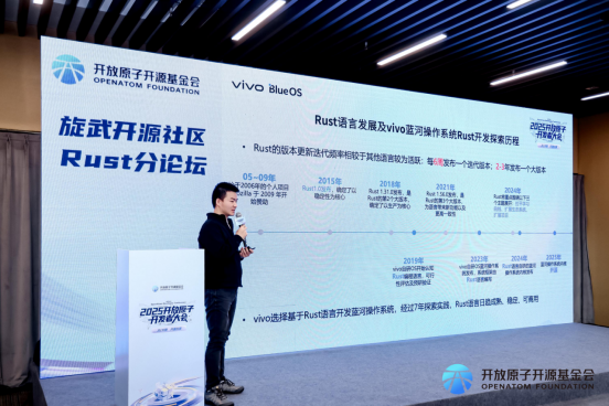 2024年,vivo基于Rust语言自研的蓝河操作系统内核正式发布,而后在2025年7月面向行业开源,并凭借安全、轻量、通用三大核心特性逐步跻身行业前沿。开源仅一周时间,该内核在GitHub 的 Star 数据便突破1000,吸引了大量开发者关注。如今,vivo将该内核捐赠给开放原子开源基金会,并正式以“BlueKernel”命名成为开源孵化项目,以全新的开源运营和治理模式面向行业。vivo将持续贡献BlueKernel开源社区,正如vivo副总裁、OS领域副总裁,vivo AI全球研究院院长周围在今年 vivo开发者大会上所言:“从自研到开源,vivo始终坚定做 Rust技术的先行者,我们将以开放姿态分享核心技术成果,与全球开发者共建繁荣的 Rust 生态。”