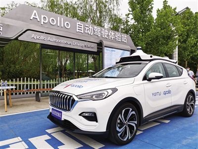 左图为自动驾驶汽车停靠在百度阿波罗自动驾驶体验站。记者 杜一方 摄