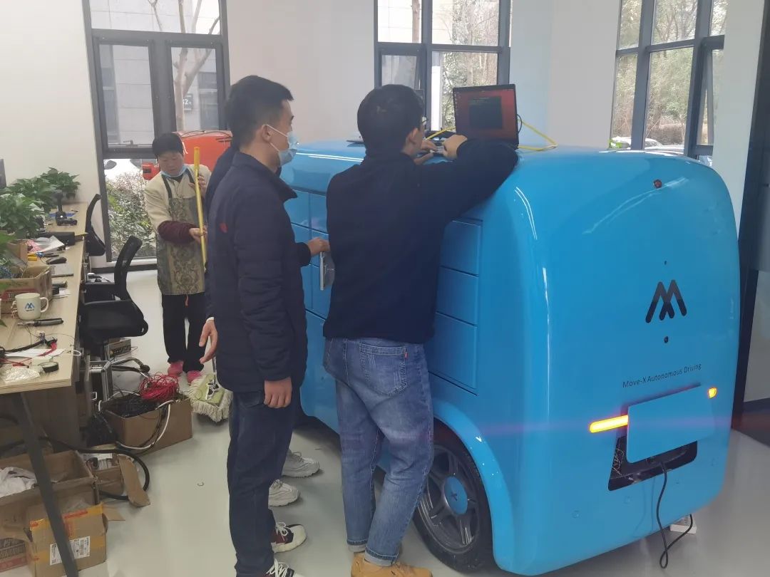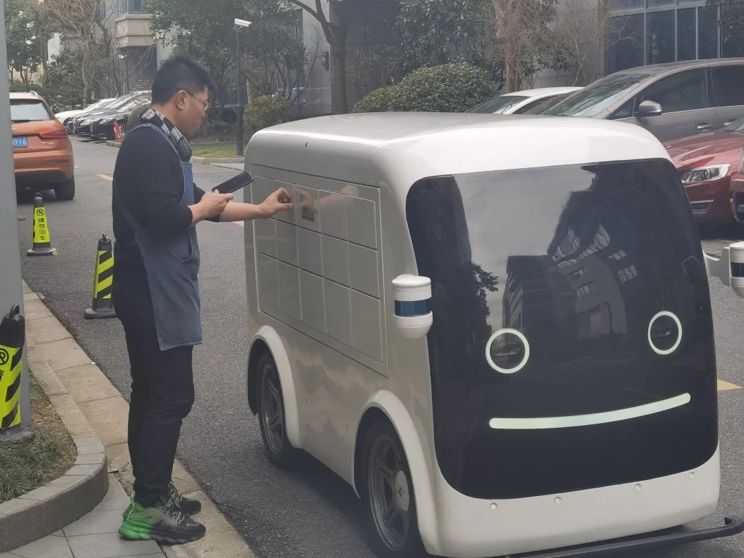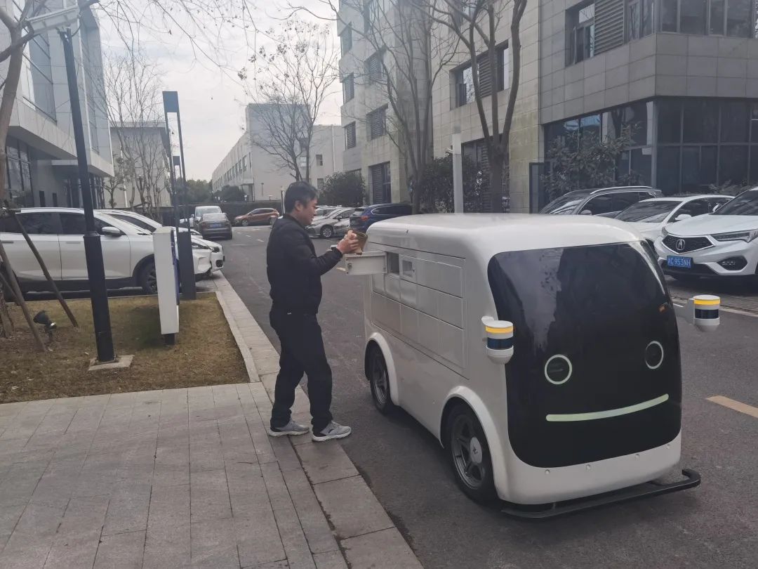 眼前这辆可爱的小车车就是由移动智地园区内的企业——智梭科技自主研发、设计、生产的L4级无人物流车。用户通过微信小程序,订购外卖,商家和站点的无人车同时接单。商家通过扫码,将物品投放到储物柜,关上门后,无人车自动开启,向目的地出发。几分钟后,一杯热腾腾的咖啡就送到了购买者手中。对于用户和商家来说,省心省力。