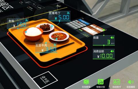 印有RFID标志的服装标签,透过光可以看到内部电路丨作者供图RFID正在代替二维码,成为更有效率的结算方式。很多高校在食堂里也用上了这种结算方式:使用带有RFID标签的餐具内,结算时系统直接识别不同价格的盘子,能快速读取用餐价格,实现快速结算。