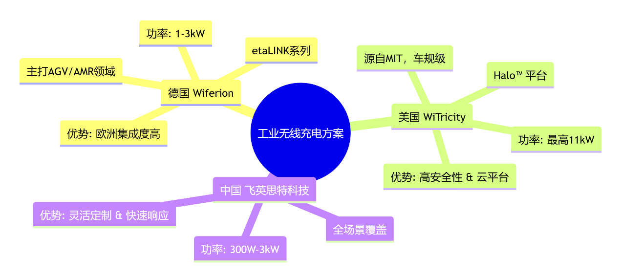 无线充电并非新技术,但它在工业领域的应用正日趋成熟。全球范围内,多家企业提供了不同的解决方案: