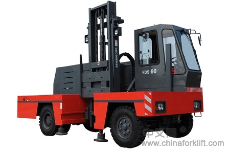 FDS内燃侧面叉车的发动机是日本五十铃6BG1,额定功率/转速82.3/2000Kw,满载时爬坡能力20度,最大起升高度(满载) 3600mm,最大起升速度(满载) 350mm/s,最大运行速度(满载) 24Km/h,轴距2800mm。