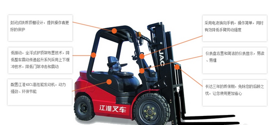 江淮J系列内燃叉车作为重工公司新一代的产品,在技术上、外观品质上有了很大的突破和创新。J系列内燃叉车采用整体式焊接护顶架结构,具有强度高、安全性好、装配省时的特点;采用双悬浮式减振结构设计,减少了车辆的振动,提高了舒适性;搭载排放达到欧美非道路三阶段标准的自产4DC1发动机,优化匹配了水箱、消音器,动力性好,节能环保;整车采用自动断电装置,提高了安全性;外观设计采用大圆弧流线型造型,更加美观。