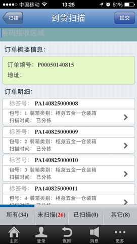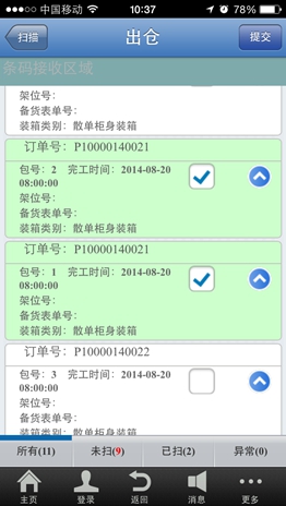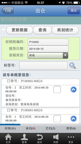 以出仓、经销商收件和到货为例。出仓,扫描所有的包,提交发货数据,可以了解到要发的货是否齐全,是否有漏包,是否有未完工的包,以及经销商、订单号、提货日期,完工日期,货架号,包号等全套匹配信息,进而做到对出仓货物疏而不漏的跟踪和查询。