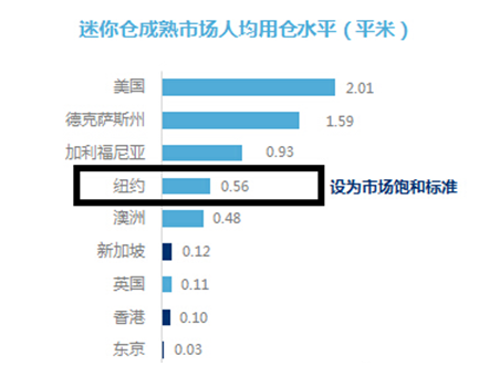 参照上图,单以国内北京、上海、深圳、广州、成都、杭州、南京七大核心城市(该七大城市均有迷你仓产业布局)为例,2014年末常住人口数为10,117 万人,假设中国的迷你仓租金水平为3 元/天/立方、高度为2.4米、场地使用率为70%;按国际市场计算公式可以得到,市场潜量=常住人口数量*饱和人均用仓水平(数值参考上图数据);中国预计年产值=市场潜量*70% *3 * 2.4*365 = 1,042亿元,这样千亿级的市场体量的确还有很大的吸引力。